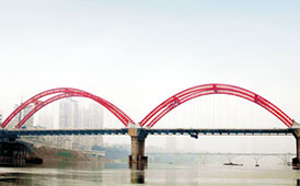 南充下中坝嘉陵江大桥 主桥为2*160米下承式钢管混凝土刚架系杆拱桥,主拱桥,主拱为横哑铃式平行拱,主桥长320米,2012年11月建成通车。