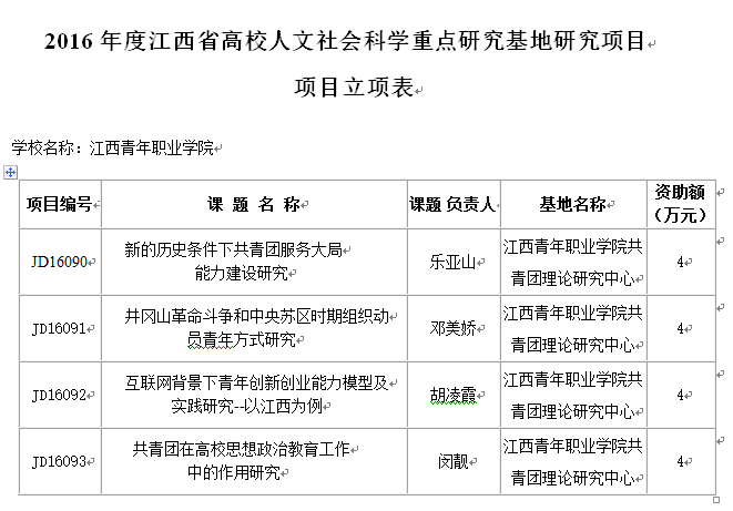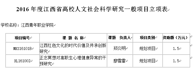 根据《关于2016年度江西省高校人文社会科学研究项目立项的通知》,我院报送的2016年度省高校人文社会科学研究项目中乐亚山、邓美娇、胡凌霞、闵靓四位老师主持的4项课题获得重点研究基地项目立项,郑炎明、廖雪菲两位老师主持的2项课题获得一般项目立项(项目名单附后)。