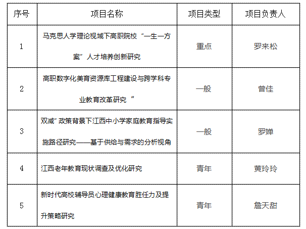 我校教师申报江西省教育科学“十四五”规划2023年度课题项目共5项,根据江西省教育厅《关于江西省教育科学“十四五”规划2023年度高职高专系列课题立项申报工作的通知》,经科研处组织校内外专家评审,评选出拟申报教育厅项目5项。现将名单公示如下: