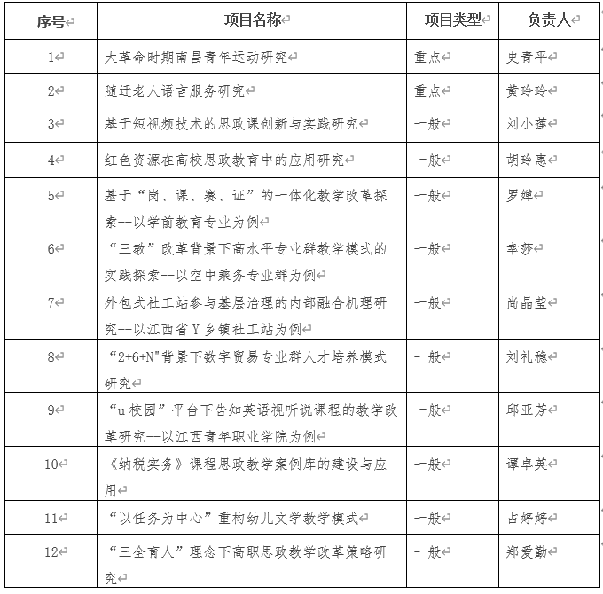 根据2023年度江西青年职业学院校本课题申报工作的要求,科研处共收到23项校本课题,经审核、专家盲审、公示,共立项12项校本课题,其中重点课题2项,一般课题10项,重点课题每项经费资助5000元,一般课题每项经费资助2000元。具体项目名称见下表。