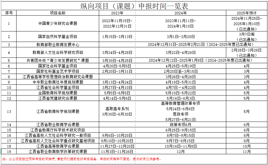 为更好地服务全校教师科研项目申报工作,科研处对2023-2024年各类课题的申报时间进行了梳理,请各位老师提前做好申报准备,表内2025年时间仅供参考。