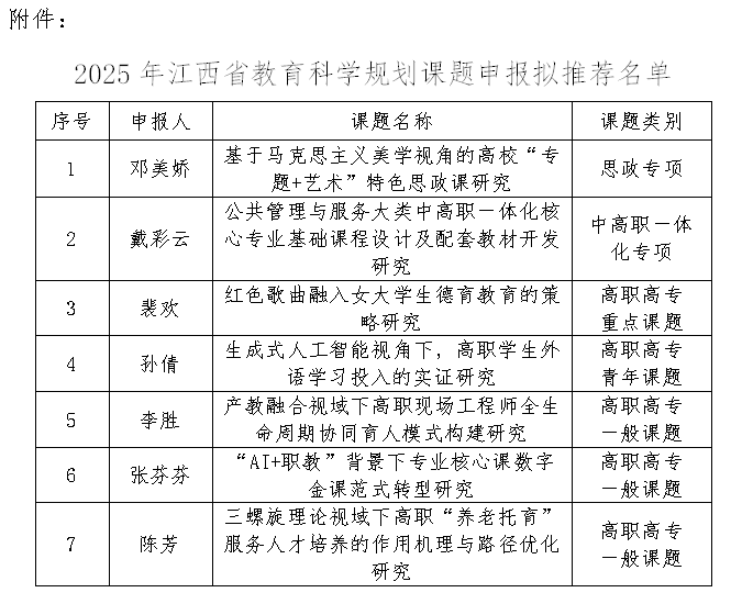 根据《关于开展2025年江西省教育科学规划课题申报工作的通知》(赣教科规字〔2025〕1号、2号、7号)文件有关规定和精神,学校组织各部门教职工积极申报,经科研处审核和专家评审,共遴选出思政专项课题1项、中高职一体化专项课题1项、高职高专系列重点课题1项、高职高专系列一般课题3项、高职高专系列青年课题1项。现将以上课题拟推荐名单予以公示,公示时间:2025年5月30日至6月3日,共计5天。