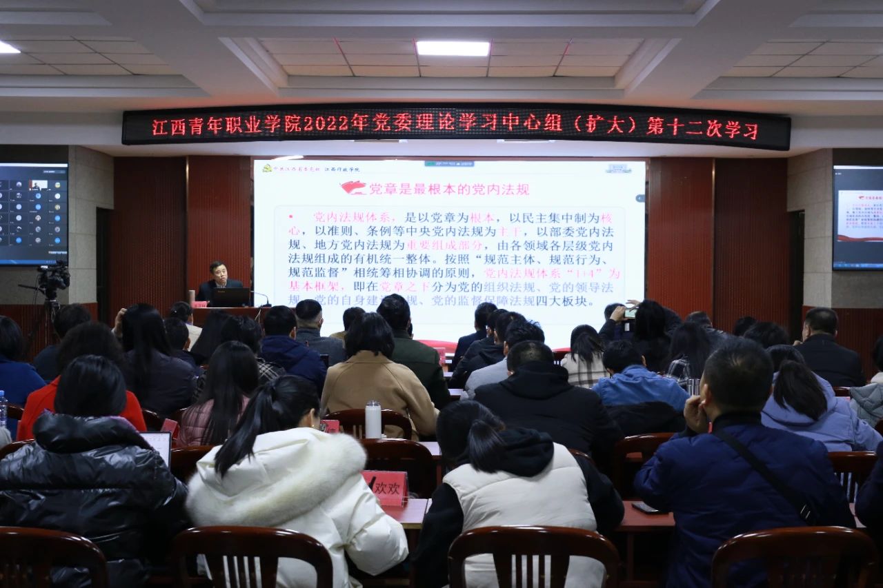 12月9日,学校在行政楼多功能厅举行2022年党委理论学习中心组(扩大)第十二次学习,专题学习《中国共产党章程》。学校党委班子成员、各党支部书记、全体中层干部及全体党员参加了学习。学习会由党委书记罗来松主持。