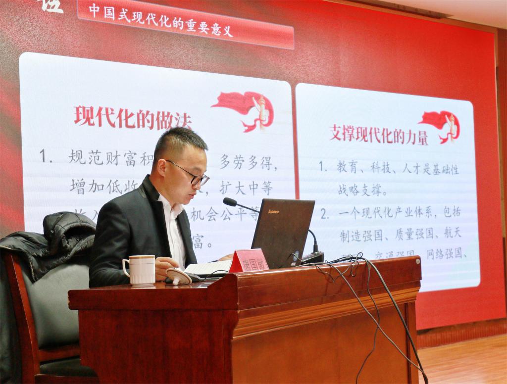 唐国徽现场传达了党的二十大报告主要精神,分享了参加党的二十大的全过程,课件内容生动详实。宣讲内容以大会前、大会中、大会后三个阶段为线索,不断将现场气氛推向高潮。他把党的二十大报告中涉及乡村振兴与助农脱贫致富的奋斗足迹进行有机融合。整场宣讲会深入浅出、感人肺腑、催人奋进,读书班全员进一步领会了党的二十大精神内涵,也提升了工作站位和担当情怀。