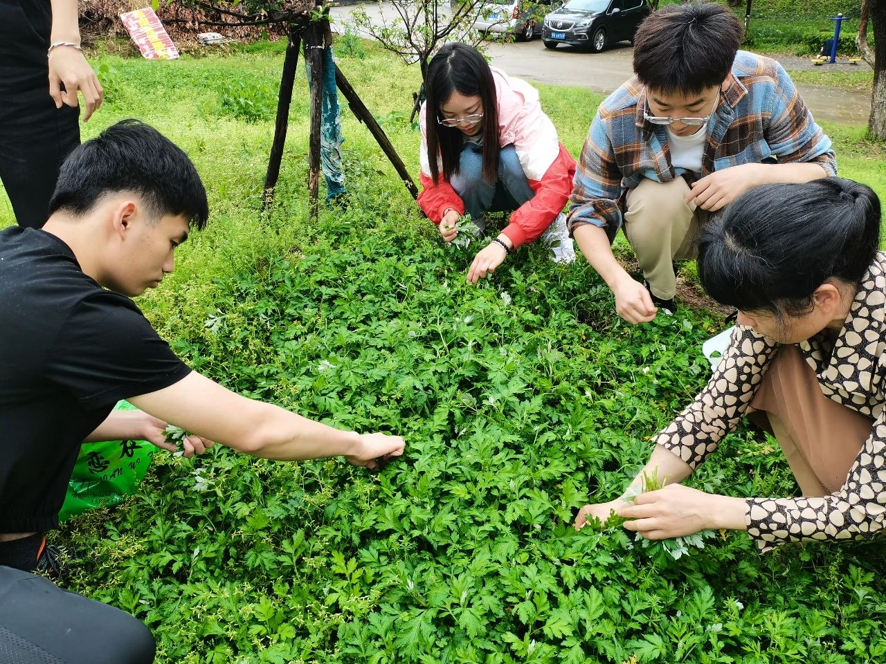 青团是传统美食中的一道美味,而新鲜的艾草则是制作青团必不可少的材料。清晨,为制作青团准备充足的原料,参加活动的师生们早早来到菜园里采摘新鲜的艾草,大家一边享受着大自然的美好,一边体验着劳动的乐趣。片刻后,全体师生们满载而归。