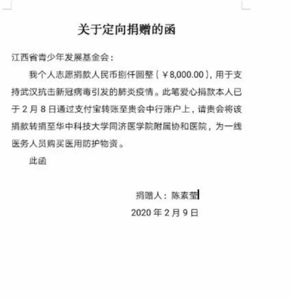 防控疫情,人人都是参与者,陈素莹看到武汉疫区疫情严重,她毅然决然得将自己的奖学金和平时兼职挣的8000元通过江西省青少年发展基金会捐给了华中科技大学同济医院附属协和医院。她希望这笔捐款能够帮到正在遭受新型冠状病毒肺炎折磨的人,同时也希望能够为国家出一份绵薄之力。说实话,在捐款名单上,这一笔捐款可能算不上什么,但对于一名在读大学生,能有这样的举动却是多么的难能可贵啊!