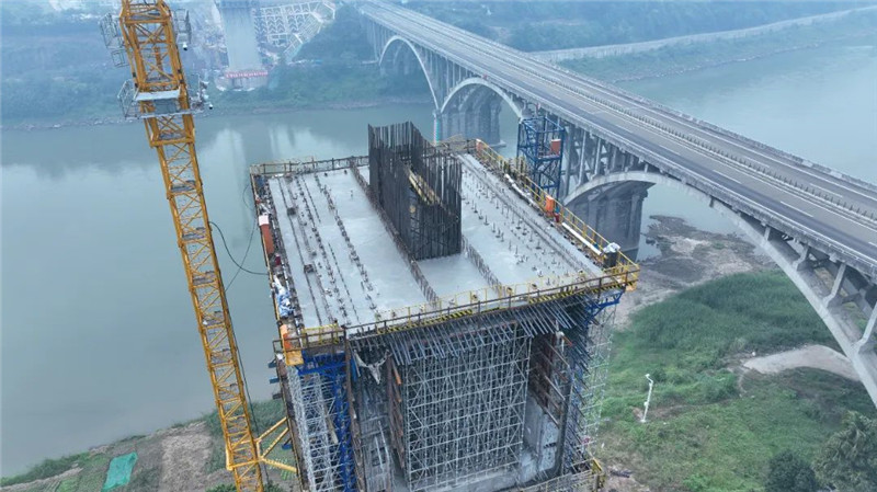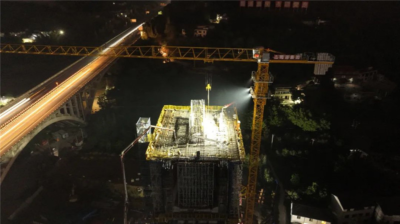 隆黄铁路隆叙段泸州沱江铁路特大桥主桥属矮塔单索面斜拉桥(酒樽造型),是国内同类型最大跨度的铁路单索面斜拉桥。该桥既是项目部的重点工程,也是全线的控制性工程。10#墩、11#墩0#块件长20m,高14m,顶宽15.8m,底宽11.7m,设计混凝土方量为2400㎥,本次10#墩浇筑混凝土为1050㎥,浇筑高度为7.8-14m。此次浇筑的顺利完成,标志着沱江铁路特大桥上部构造施工拉开序幕,项目整体施工取得阶段性胜利,为沱江铁路特大桥在2023年完成建设任务奠定了坚实的基础。