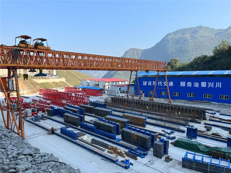 1号预制场位于K69+300~K69+203路基上,路基宽度60m,总长度97m。主要用于吾多拉达大桥、乌角村2号大桥和乌角村1号大桥、雷波互通式立交(B匝道大桥)的T梁预制。预制场总体规划布设2排预制台座,每排设置10个40m装配式台座(可变30m),该台座采用定制的型钢台座,可调节满足27m至41mT梁的浇筑,保证了本项目所有T梁的预制需求。1号预制场根据预制梁板吊装重量,配置2台80t跨度51m的龙门吊,用于T梁的预制及吊装,同时场内设置运输通道2条、施工蓄水池2个,三级沉淀池1个、智能喷淋养护系统及安全围挡等附属设施,为T梁安全生产、绿色生产提供了有力保障。