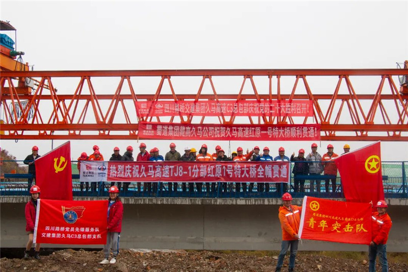 10月16日,党的二十大在北京隆重召开的消息传遍巴蜀大地,给奋战在雪域高原的久马高速建设者带来攻坚克难的力量。17日下午14点,随着最后一片T梁稳稳就位,红原一号特大桥在全体参建人员的不懈努力下顺利实现全幅贯通。