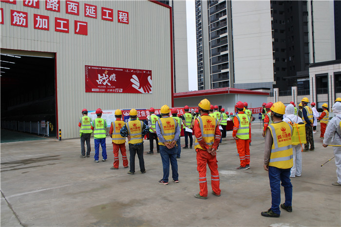 新冠状病毒阻击战持续近两个月,治愈率极大提升,社会秩序持续稳定,同济路西延工程复工生产也稳步向前推进。但还未取得疫情防控最终胜利,疫情防控仍需“咬定青山不放松”。为切实提高全体从业人员的自我防护意识和提升全体员工应对突发疫情的处理能力,确保发生疫情及突发事件时,应急响应工作能高效、有序开展,及时控制事件发展状态,减少和消除事故造成的损失和影响。3月23日下午15:30,同济路西延工程在张槎岸施工现场组织开展了新冠病毒疫情防控应急演练,禅城区交通运输局交建科科长庄振农、安全科人员、建设单位代表、监理单位代表、设计单位代表至现场进行演练观摩。