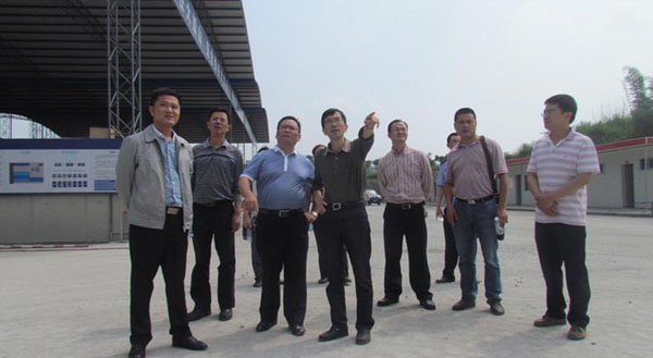 谢副市长(前中)在四川路桥成贵铁路项目经理部党支部书记夏勇(前左一)陪同下参观一分部标准化拌和站。