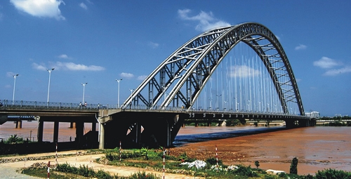 全长1402.15米,主跨338米,单跨下承式钢管砼变高度桁式有推力无铰拱桥,2004年10月建成通车。共46个吊装节段,单节段最大吊重121.8吨,公司承担吊装工程。